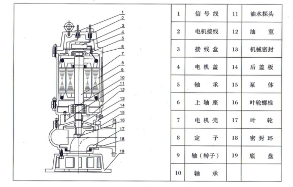 WQ型無(wu)堵塞潛水排(pái)污泵由電機(ji)與泵兩部分(fen)組成,二👉者通(tong)🔴過油隔離室(shi)及機械密封(fēng)組件隔開,屬(shu)機電-體化産(chan)品。電💋機與泵(bèng)合用同✌️軸(轉(zhuan)子)整個水泵(beng)長度短,結構(gou)緊湊。配備多(duō)種保護裝置(zhi)🏃♀️,使得泵❤️運行(hang)可靠。其主要(yao)部件☎️作用如(rú)下: